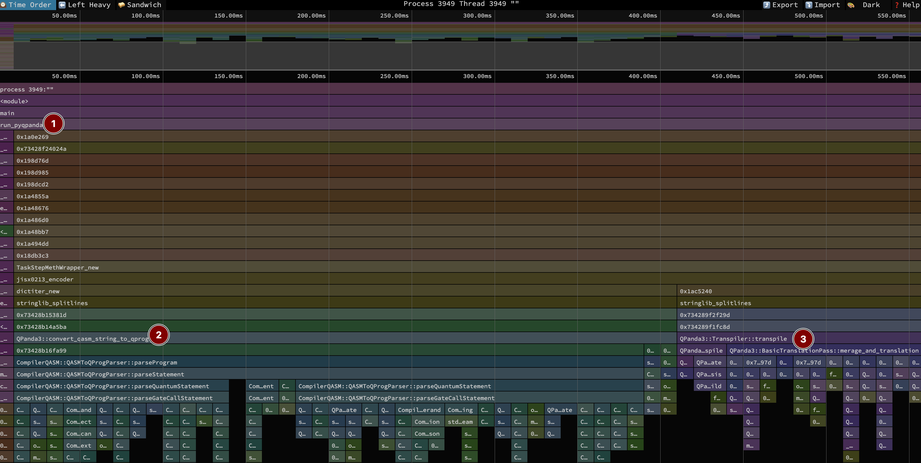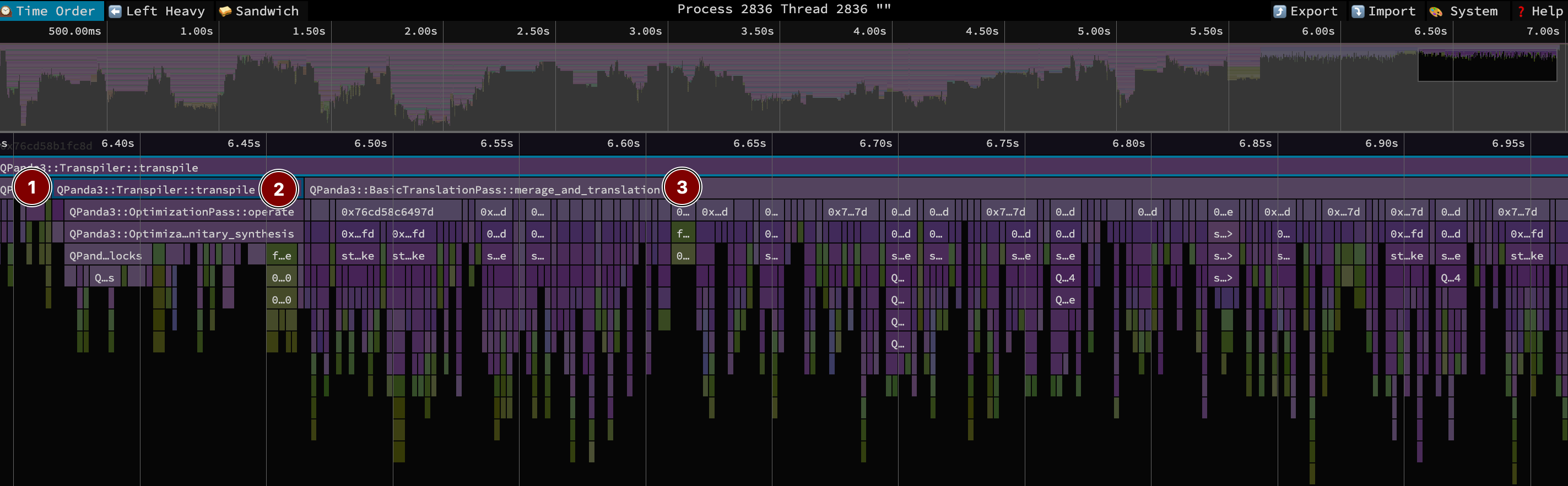 This timeline view zooms in on the transpilation call, which has three main phases
