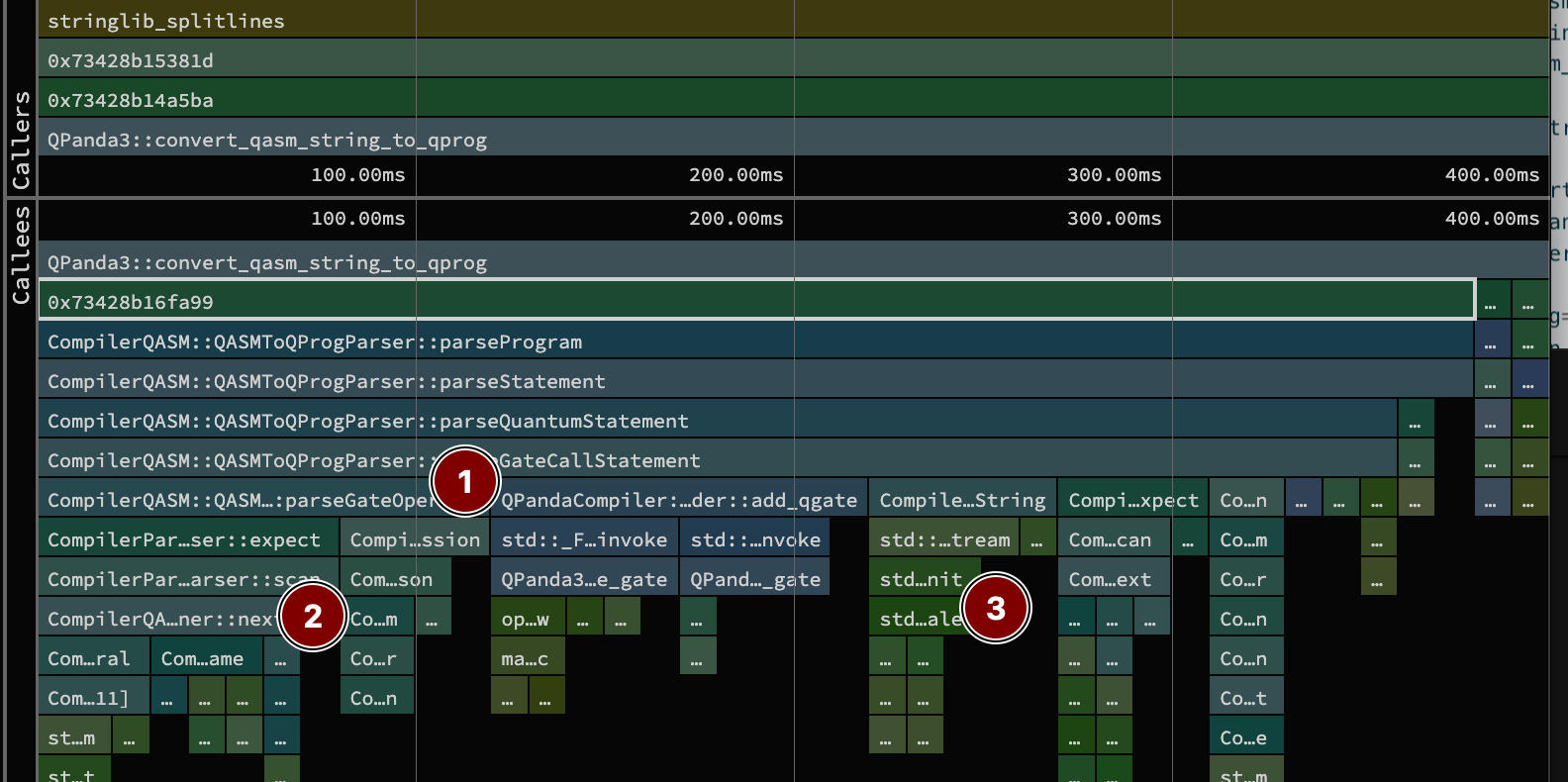 In the sandwich view above, we see what is likely a hand-built parser + tokenizer. The hierarchy of calls to 1 show the parser side, where a program is comprised of statements, which can probably be quantum or classical. Our QASM file is all quantum ones that are gate calls with operands. Below those parsers in 2 you can see a call to CompilerQASM::QASMScanner::next